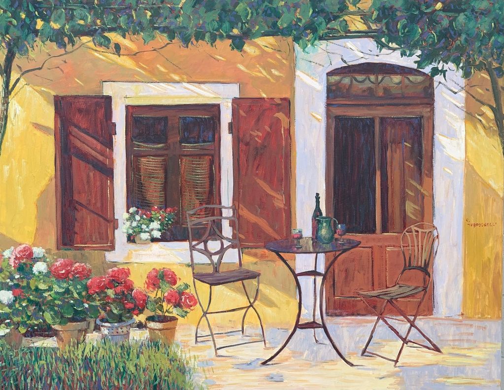 "Vases with White Chairs on Veranda"